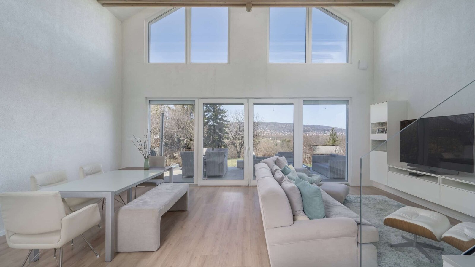 Die großen Fensterflächen des Hauses eröffnen einen beeindruckenden Blick auf die grünen Hügel und die ruhige Umgebung.