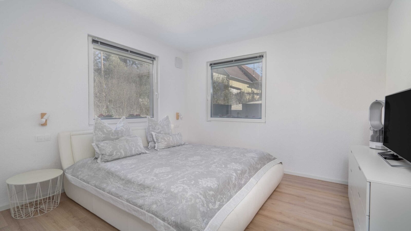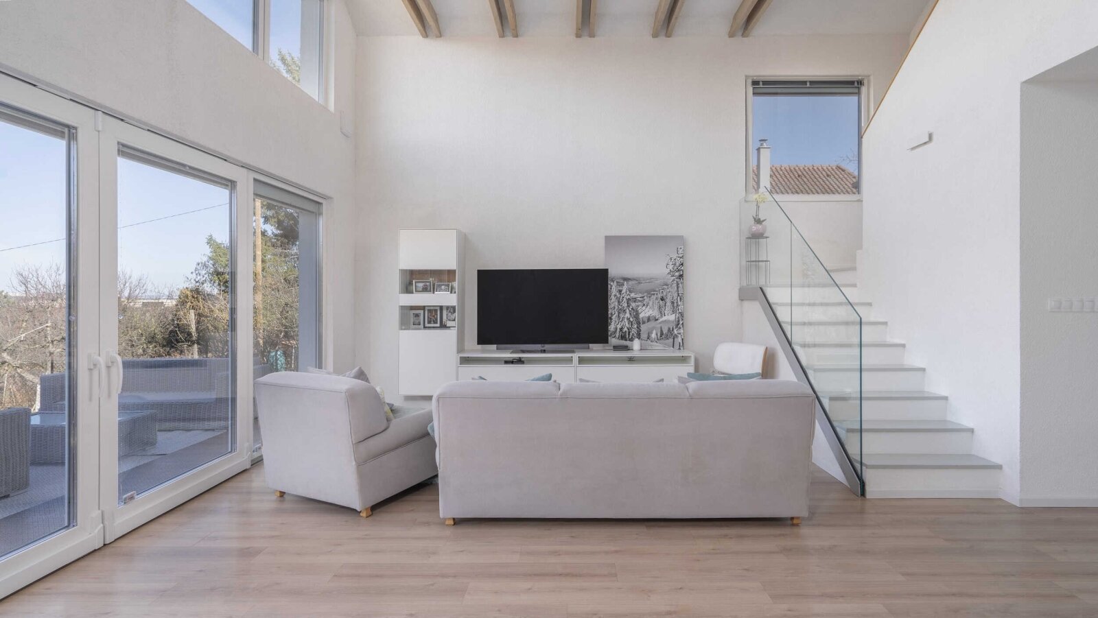 Die Immobilie verfügt über 160 m2 Wohnfläche und insgesamt fünf Zimmer. Im Erdgeschoss befindet sich ein heller, offener Wohnbereich mit direktem Zugang zur großen Terrasse mit Panoramablick, ein Schlafzimmer mit begehbarem Kleiderschrank und eigenem Bad, Waschküche, Speisekammer und ein Gäste-WC. Das Obergeschoss bietet drei weitere Schlafzimmer und ein zweites Badezimmer.