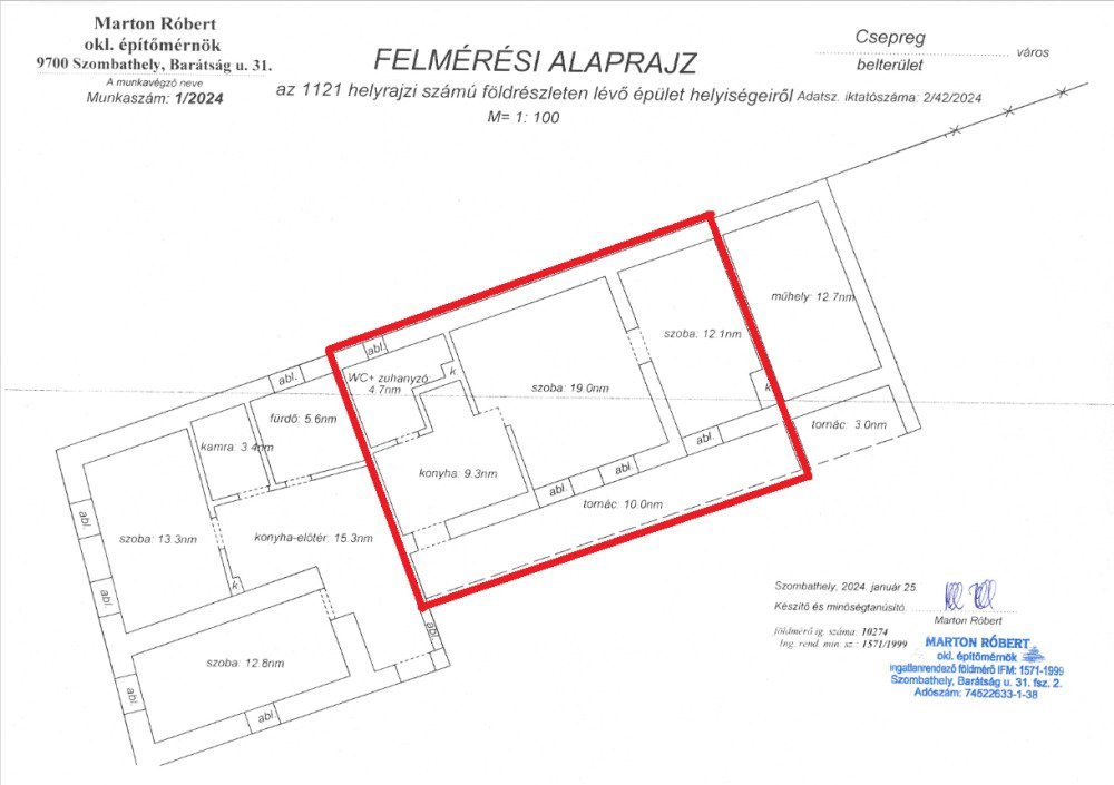 Az alaprajzon és a térképen a lakás pirossal, a hozzá tartozó (szóban megállapodott) kizárólagos telekhasználat pedig kékkel van jelölve.