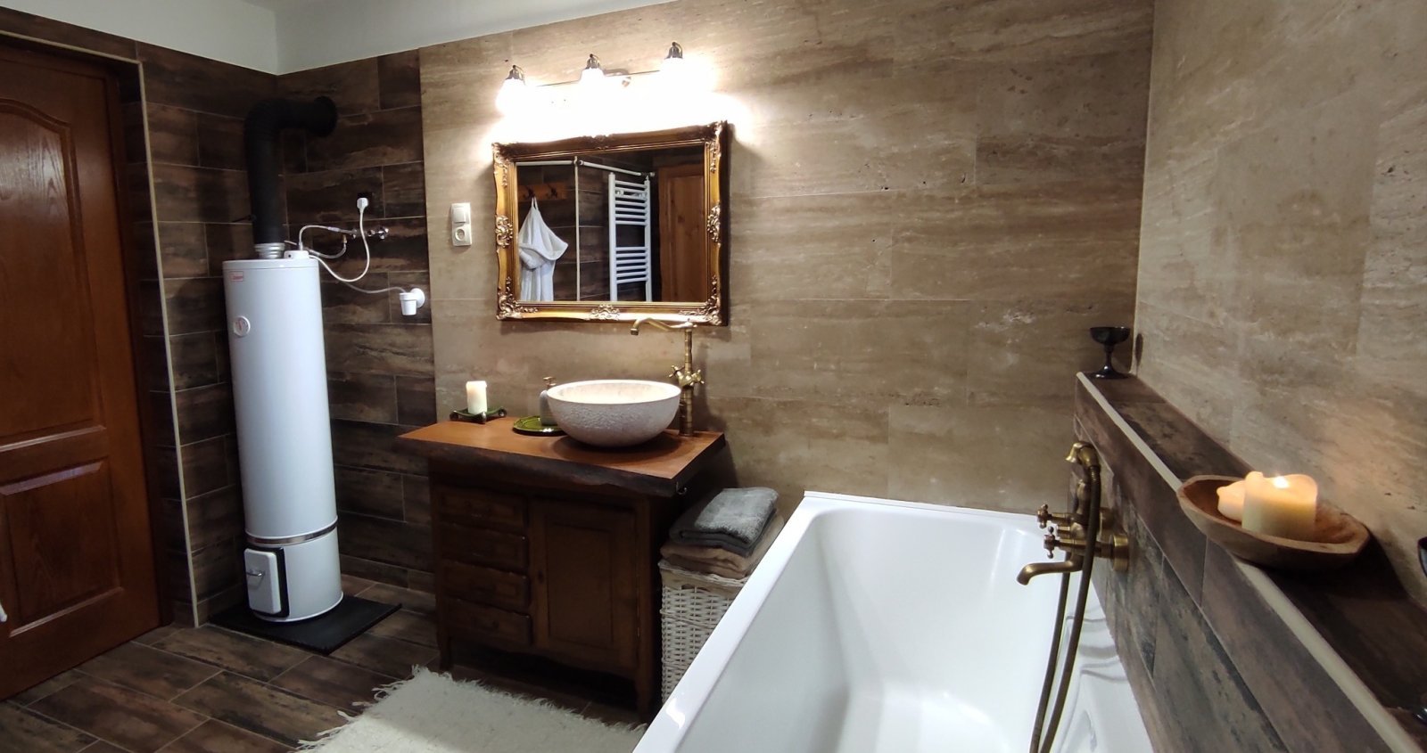 A fűtési rendszer különálló, vegyes tüzelésű kazánból, téglakemencéből és a fürdőszobában található fatüzelésű kályhából áll. A telken gázcsatlakozás áll rendelkezésre.