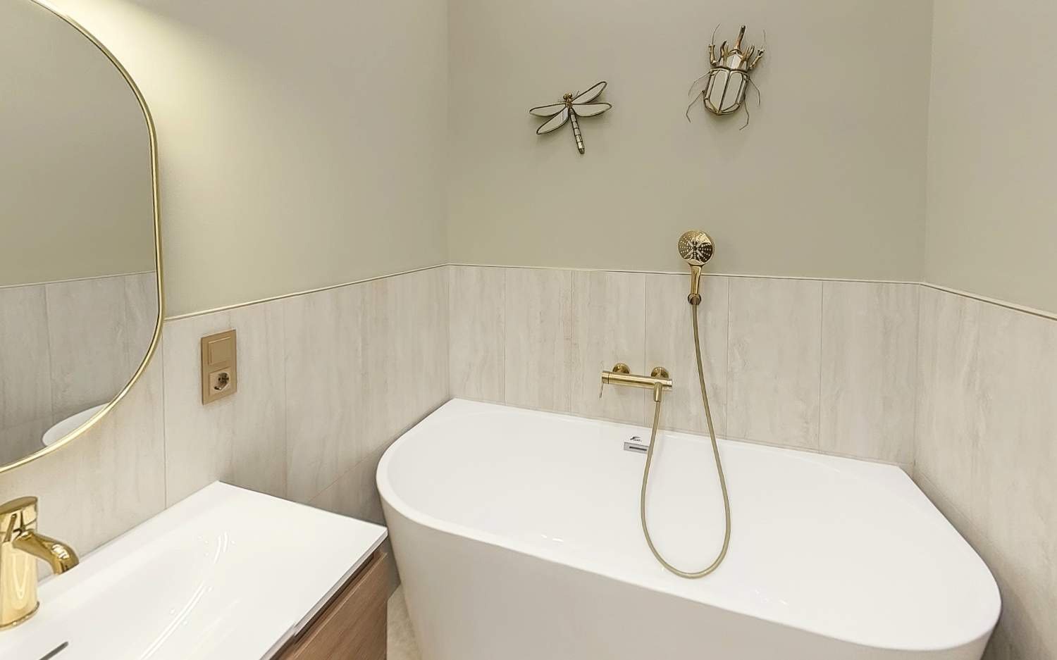 Balra a nappali található, ahonnan az egyik fürdőszobába jutunk be, amely kényelmesen berendezett vonzó csempével és arany színű szerelvényekkel.