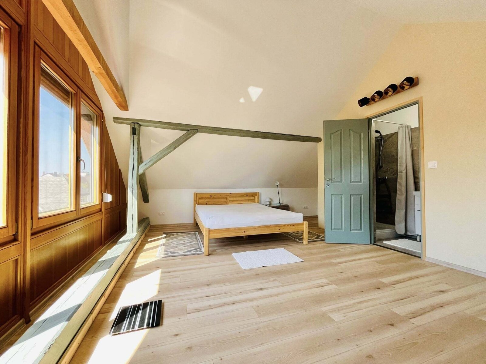 Die obere Wohnung bietet ebenfalls ein Wohn-Esszimmer, Küche, Schlafzimmer und ein Bad mit WC. Im ausgebauten Dachgeschoss finden Sie zusätzlich ein Arbeitsbereich, ein weiteres Schlafzimmer und Badezimmer mit WC.