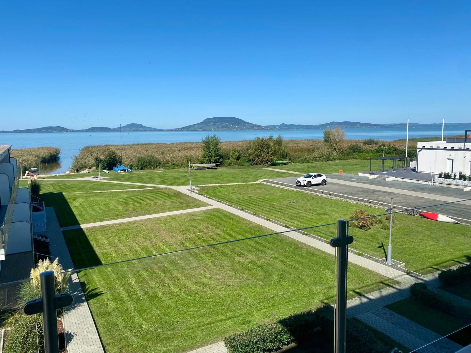 Zárt, privát telek gyeppel, parkosított kerttel, napozóval és úszórésszel, valamint közvetlen hozzáféréssel a Balatonhoz