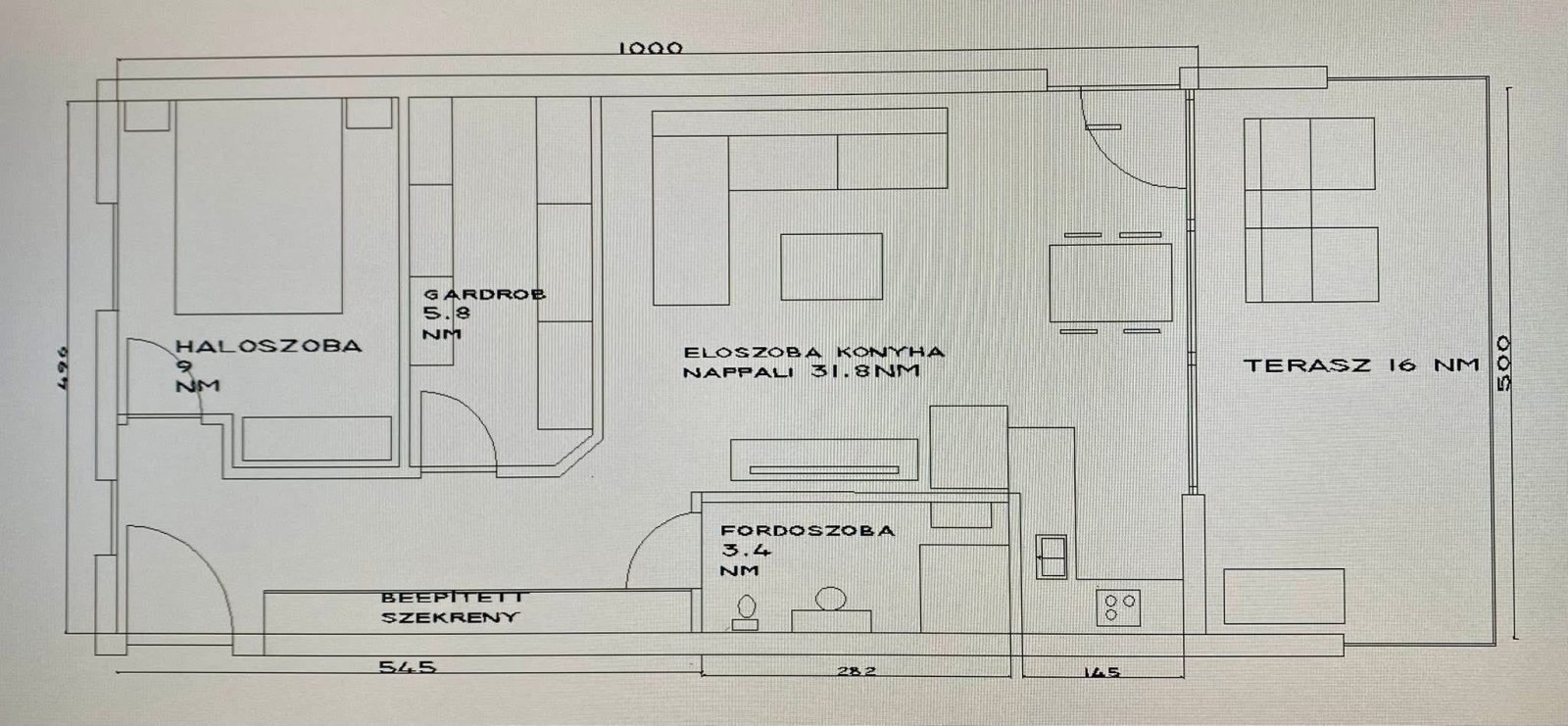 Nyitott terű nappali/étkező nagy üvegfronttal, beépített szekrényekkel és falburkolattal ellátott előszoba, hálószoba gardrób vagy beépített szekrény beépítési lehetőséggel, tárolóhelyiség (jelenleg polcos gardróbként működik), fürdőszoba zuhanyzóval és WC-vel, tágas fedett terasz redőnyökkel