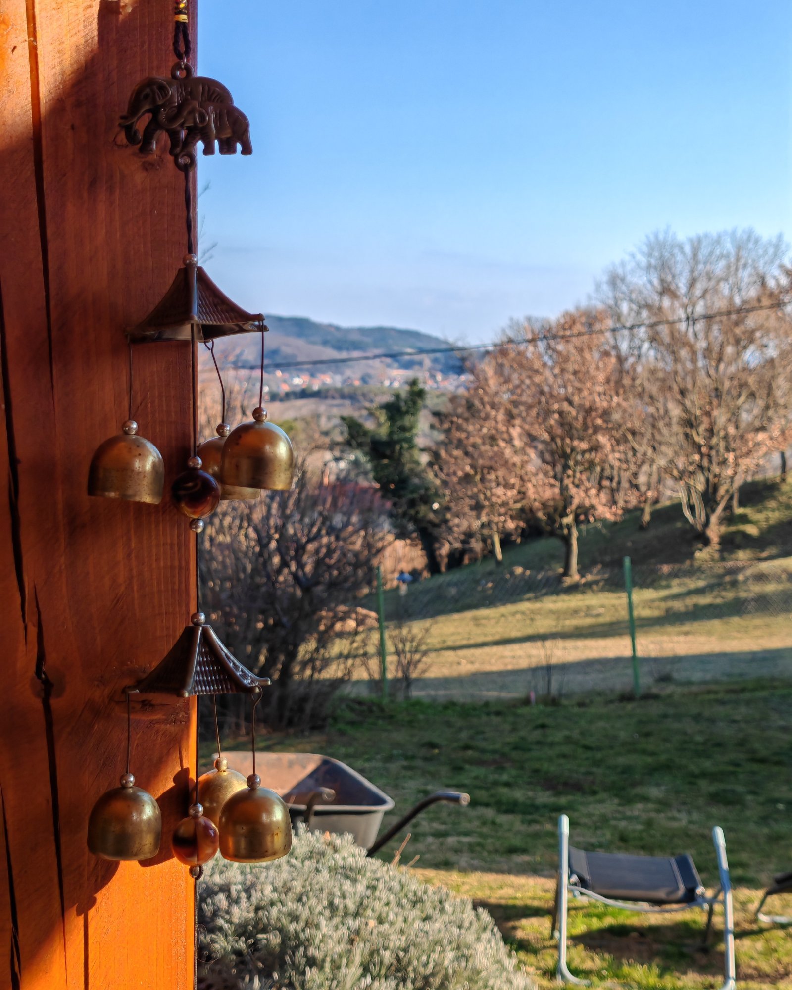Az ingatlan körülbelül 700 négyzetméter alapterületű, és különböző gyümölcsfák és levendula növények veszik körül.