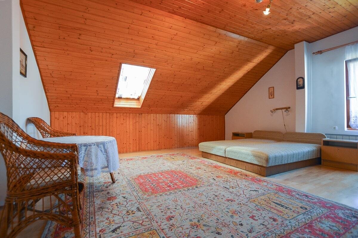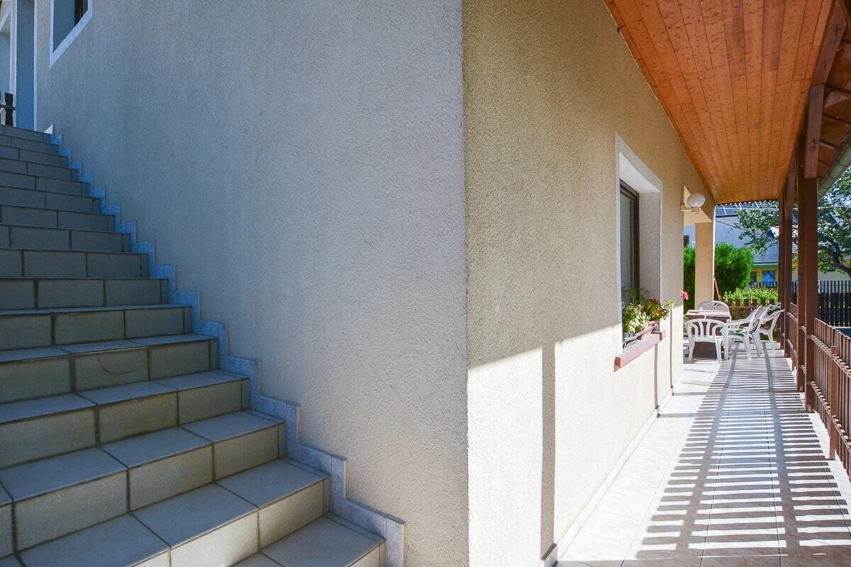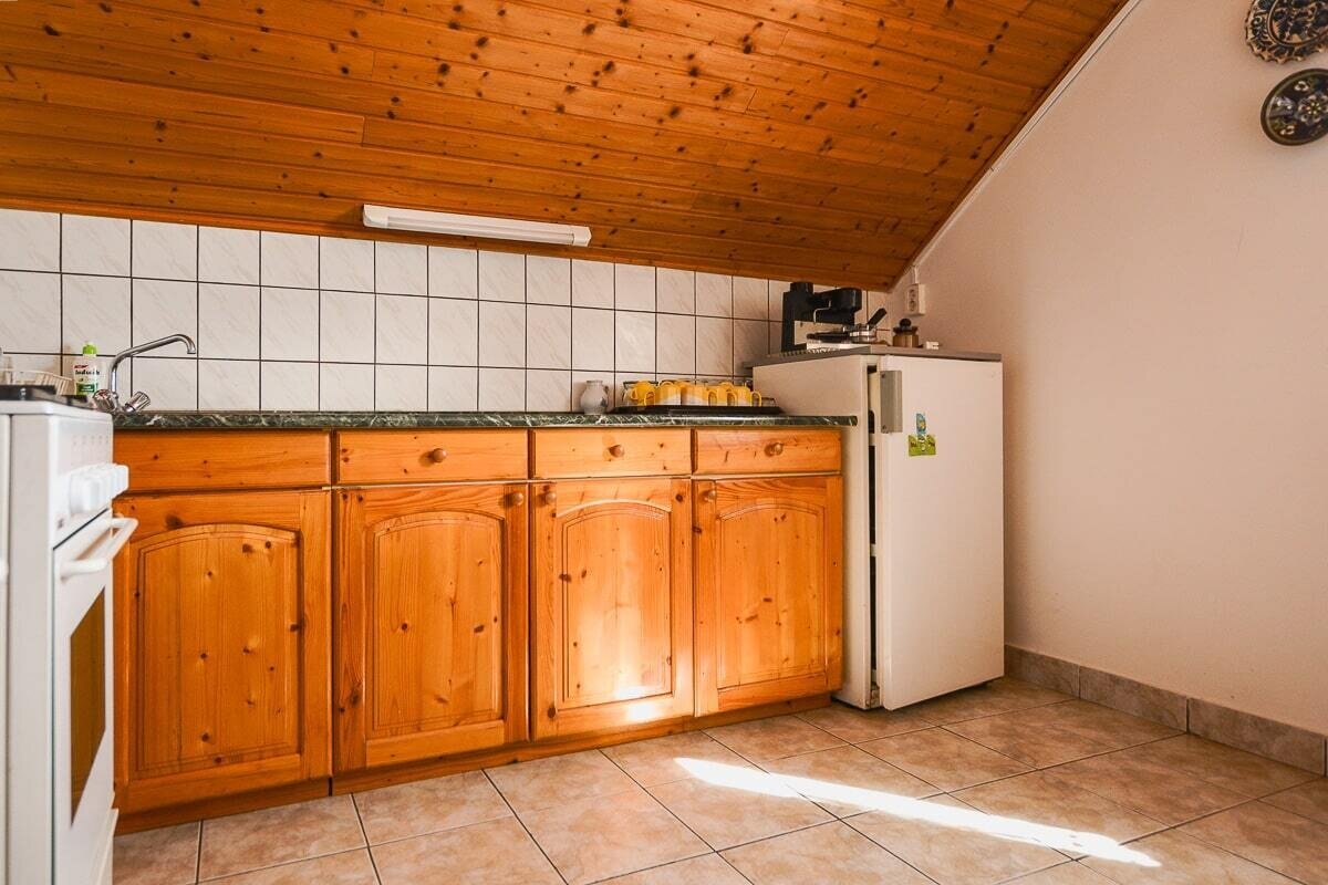 Im Zentrum von Gyenesdiás ist dieses ständig instand gehaltenes Einfamilienhaus mit zwei Wohneinheiten zu verkaufen. Das Haus ist von weitläufigen Innenräumen geprägt. Die zwei Geschöße des Hauses sind durch separate Eingänge zugänglich. Auf beiden Geschößen sind Küche, Badezimmer und Schlafzimmer eingerichtet. Der Garten kommt mit einer Garage und einem Gäste-Apartment mit Küche, Badezimmer + Wc, Schlafzimmer. Das Haus wird über Gaszentralheizung erwärmt, darüber hinaus gibt es im Erdgeschoß ein schöner Kachelofen zwischen dem Wohnzimmer und dem Schlafzimmer. Das Haus ist für Nutzung als ständigen Wohnsitz ideal. Das Grundstück ist liebevoll gepflegt, mit immergrünen Arten und Obsbäumen bepflanzt. Der Plattensee liegt 800 m weit entfernt.