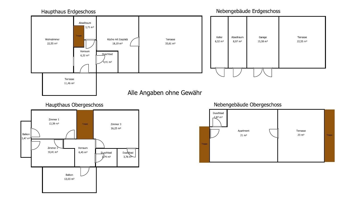 Im Erdgeschoss mit ca. 55 m² Wohnfläche befindet sich der Eingang, ein Vorraum mit Garderobe, ein Wohnzimmer, ein Duschbad sowie ein Abstellraum und eine Küche mit Essplatz. Hier liegen drei Terrassen: zwei mit 12 m² beim Eingang und eine mit 34 m² neben der Küche.