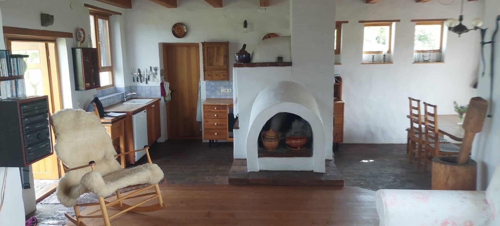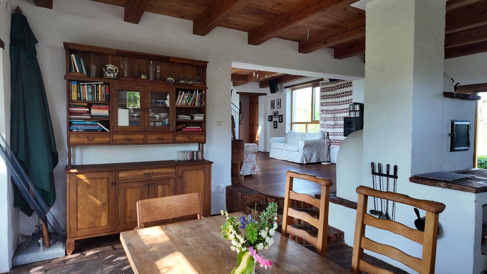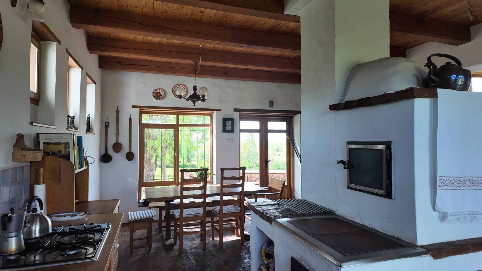 Die Holzfenster und -türen sind mit Doppelverglasung ausgestattet, was für ein angenehmes Wohnklima sorgt. Die Bodenbeläge bestehen aus einer stilvollen Kombination aus Ziegelboden und massiven Holzdielen, die dem Haus eine warme, natürliche Ausstrahlung verleihen.