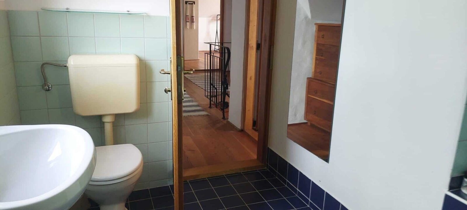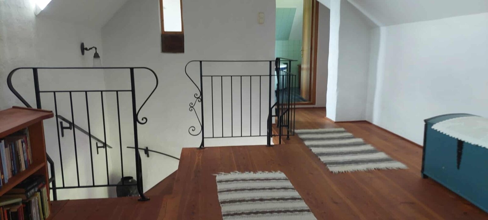 • Oberes Geschoss: Zwei Schlafzimmer und ein Badezimmer mit Badewanne
