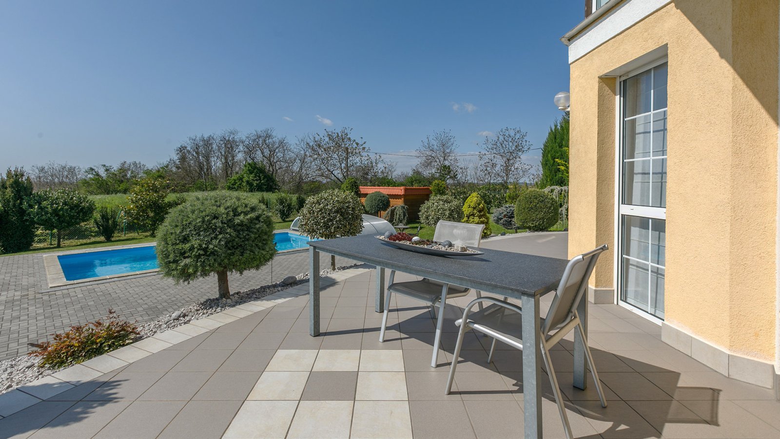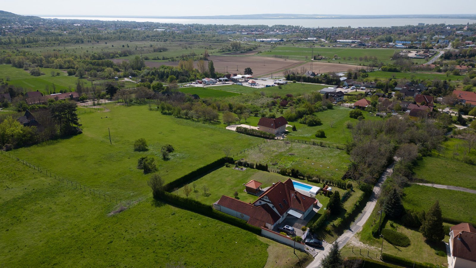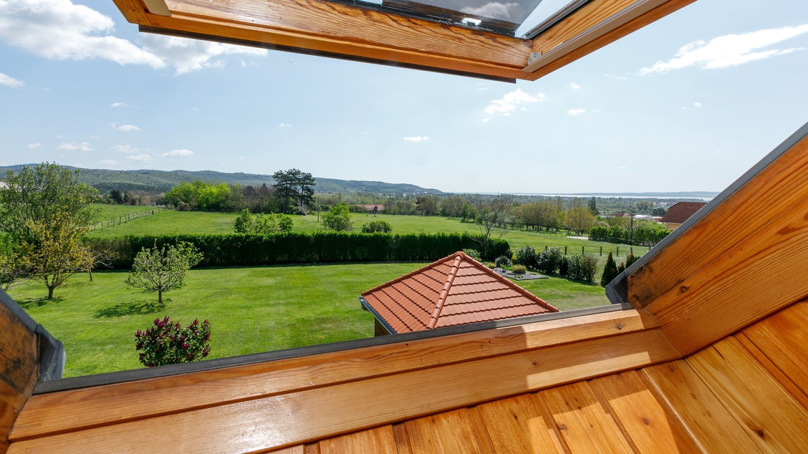 A ház a közkedvelt Cserszegtomaj faluban található, és nemcsak lélegzetelállító balatoni panorámát, egy 8x4 méteres medencét, hanem abszolút magánéletet is kínál. Az építés és a karbantartás során gondosan ügyeltek a minőségre és a kivitelezésre. Például a falakat 44 téglából, plusz szigeteléssel építették.
